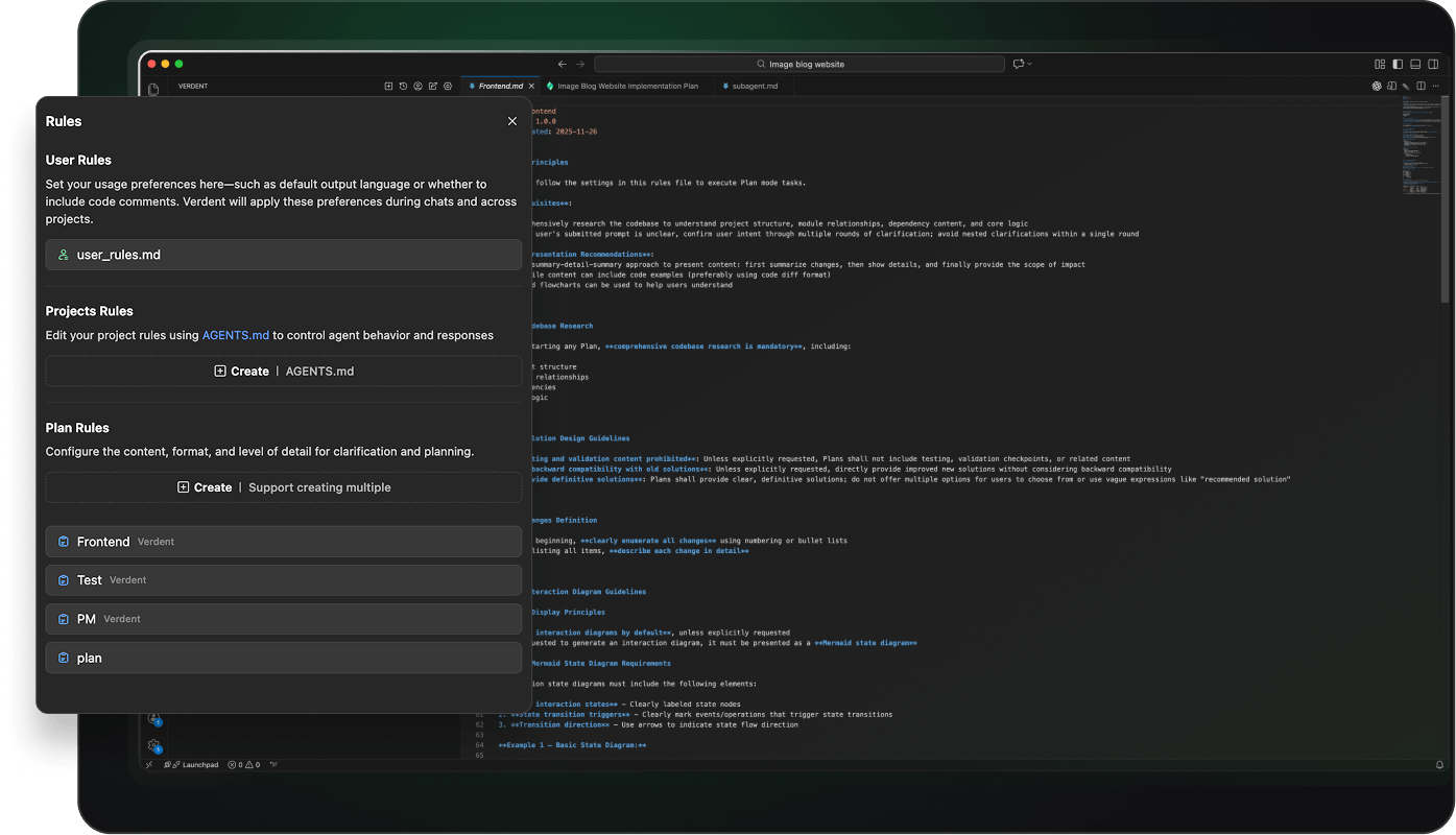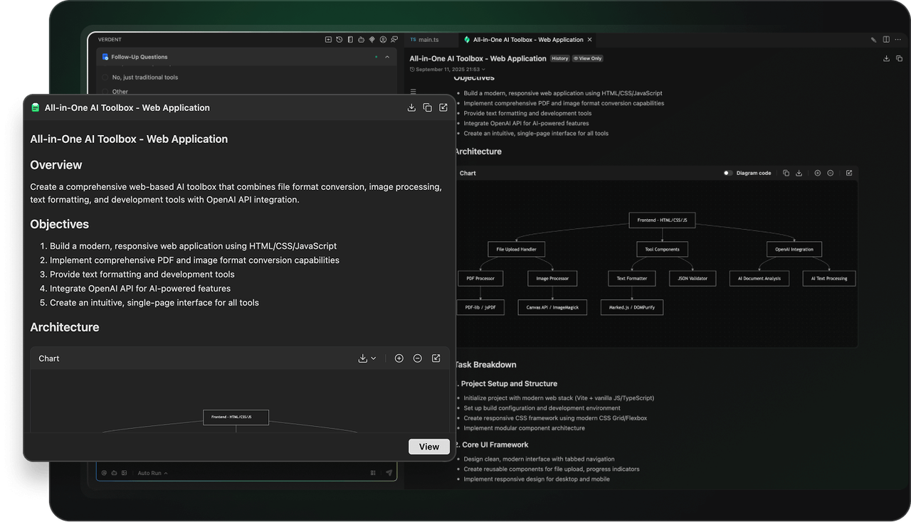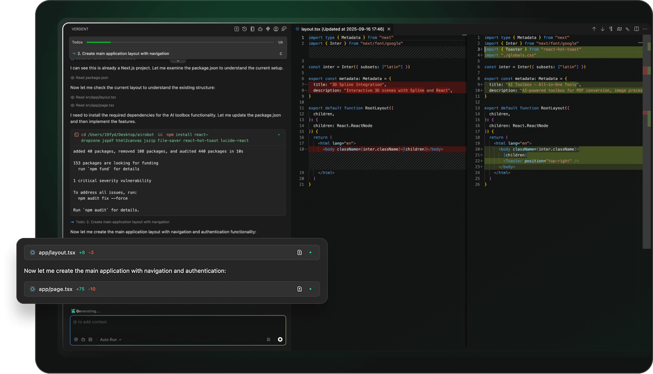 Verdent turns your idea into structured steps and verifies outcomes as it builds.